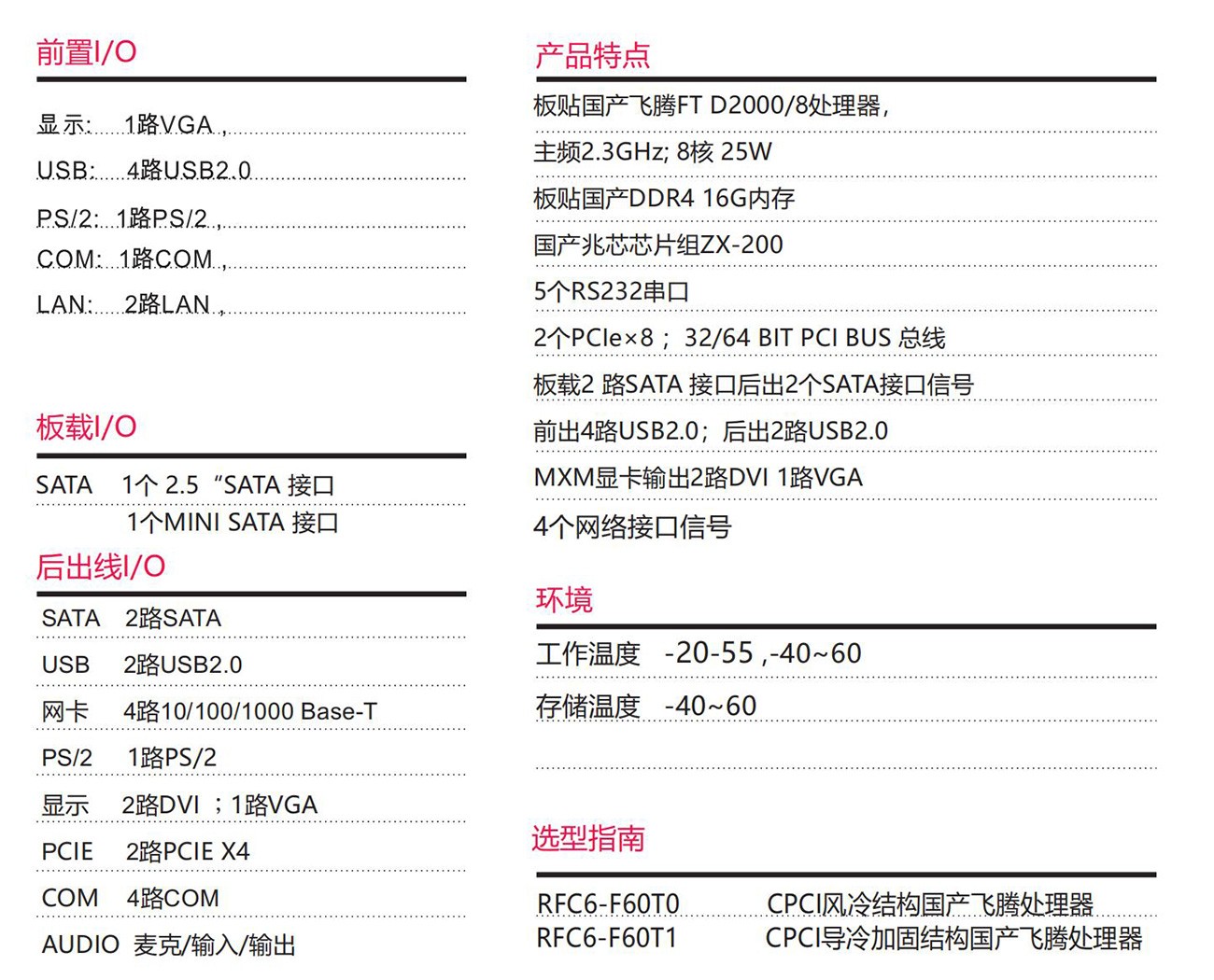 采用國產飛騰處理器FTD2000/8+ZX-200芯片組按 國產100%設計,6U CPCI規格。具備豐富的外圍接口;設計了高效的散熱系統,可顯著提高處理器的浮點運算性能,以太網、PCIE、支持高帶寬數據傳輸,滿足視頻采集與處理、雷達和聲吶等應用對高速數據傳輸的要求。專為惡劣環境使用而設計,滿足無人機、裝甲車、水面艦艇等軍工領域。