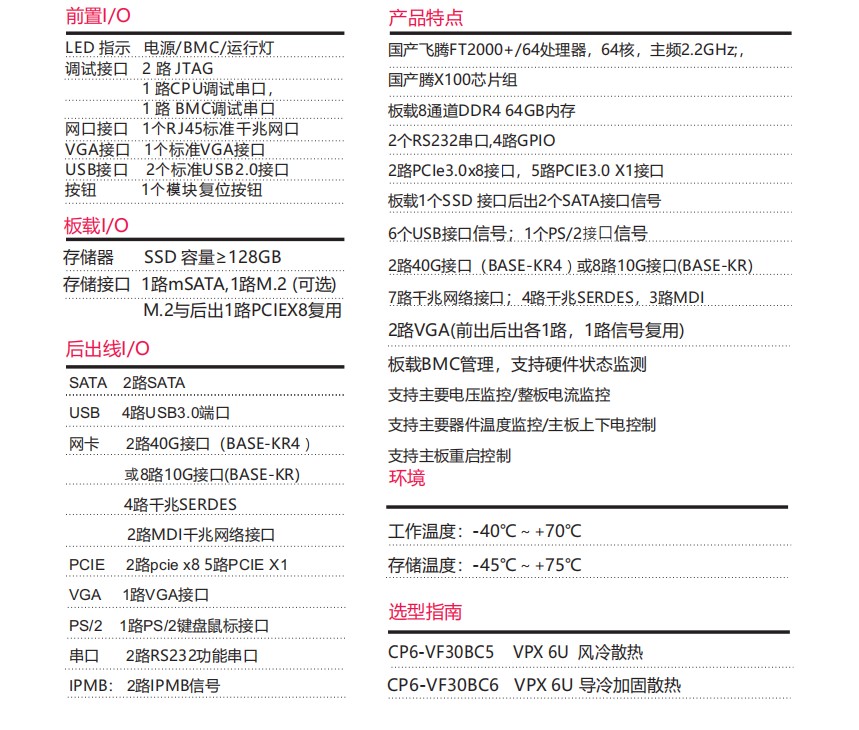 模塊基于飛騰FT2000+/64處理器,選用飛騰自 X100橋片。模塊支持100%國產(chǎn)化設(shè)計(jì)。符合 Vita65規(guī)范,6U VPX規(guī)格。具備豐富的外圍接口; 設(shè)計(jì)了高效的散熱系統(tǒng),可顯著提高處理器的浮點(diǎn)運(yùn) 算性能,以太網(wǎng)、PCIe、支持帶寬數(shù)據(jù)傳輸,是一款 滿足視頻采集與處理、雷達(dá)和聲吶等應(yīng)用對(duì)高速數(shù)據(jù) 傳輸?shù)囊蟆M足無人機(jī)、裝甲車、水面艦艇等軍工領(lǐng)域